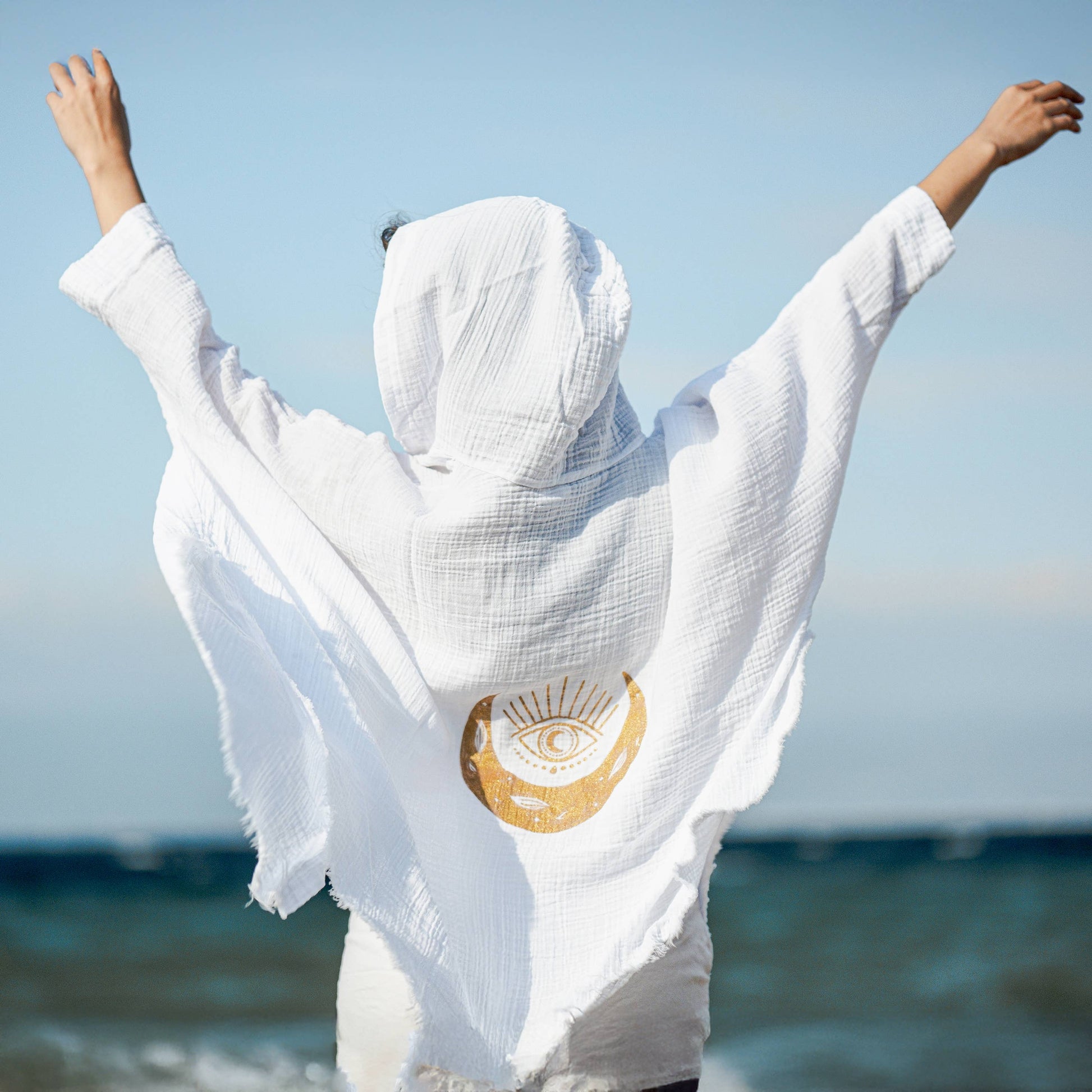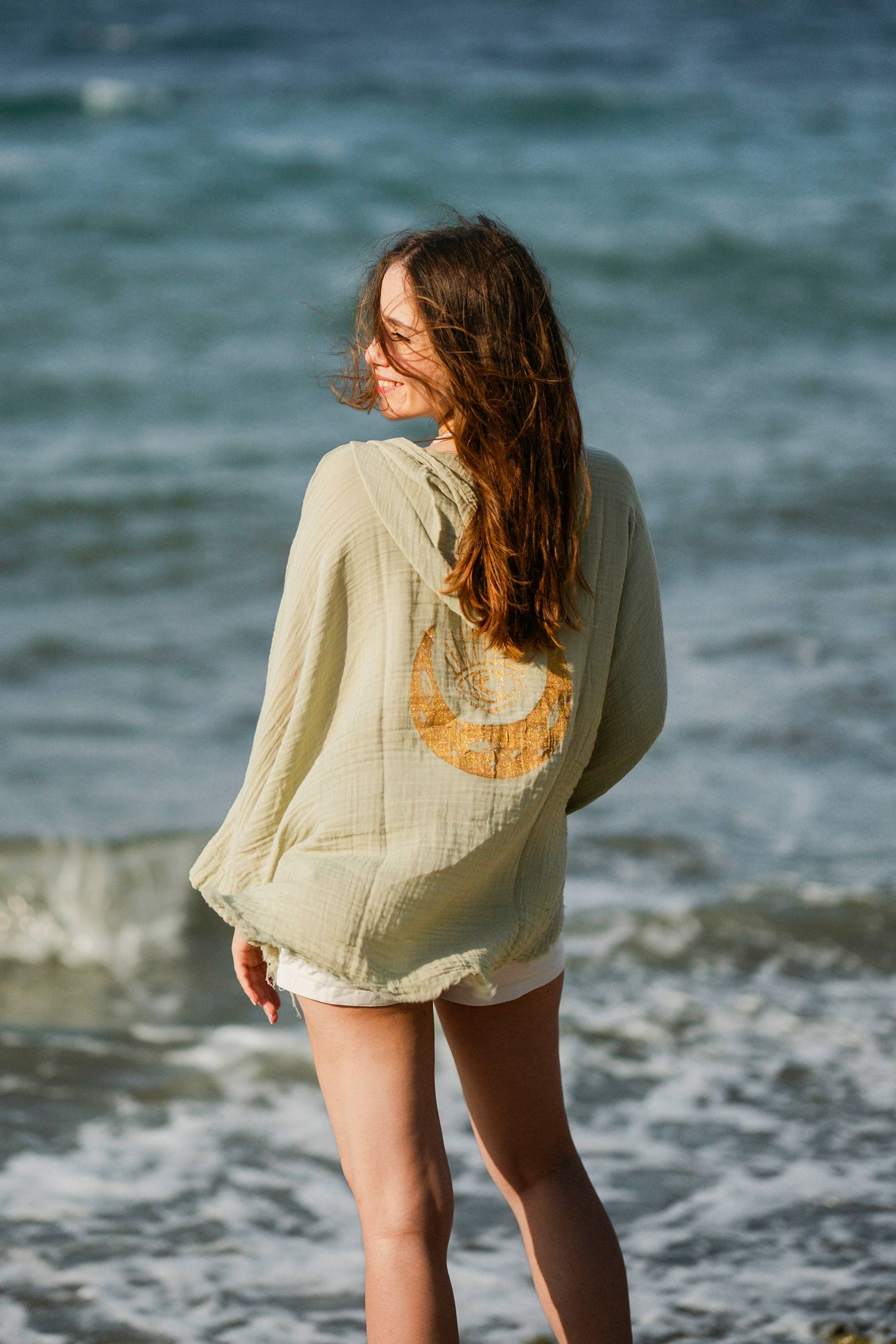 Evil Eye and Moon Double Gauze White Hooded Robe : Sage Green