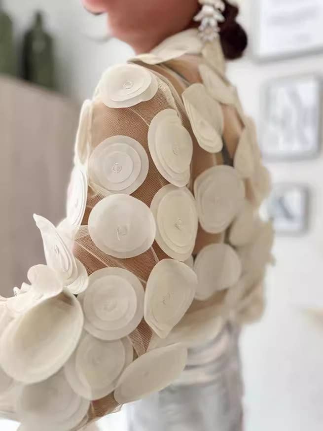 Sheer Mesh Embroidered Long Sleeve Shirt: M